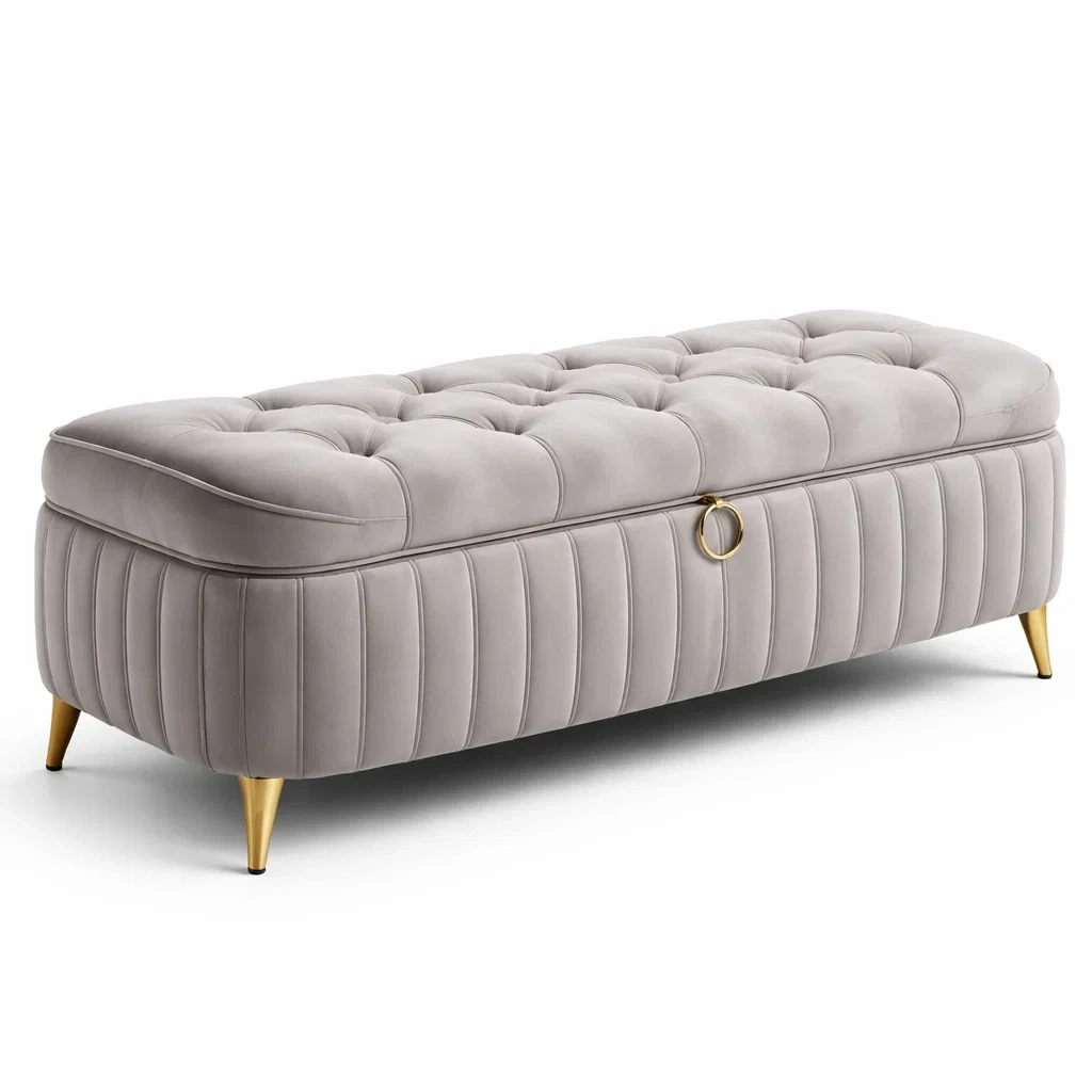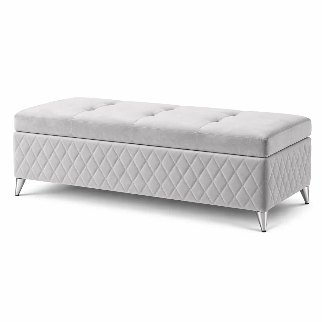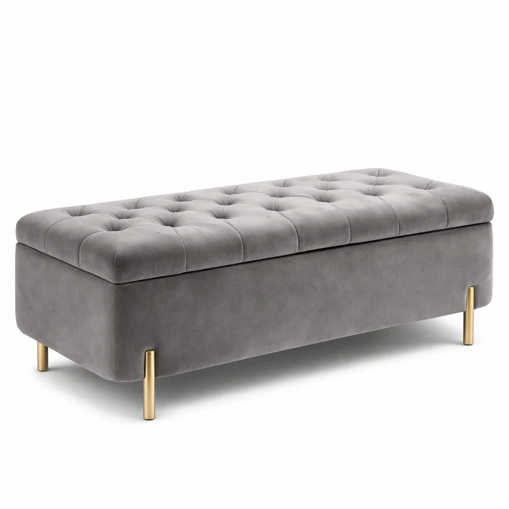 Banc de rangement en velours gris avec pieds en métal