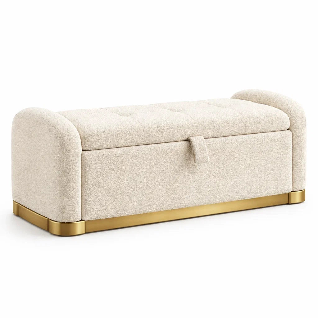 Banc de rangement en tissu beige avec base en métal doré
