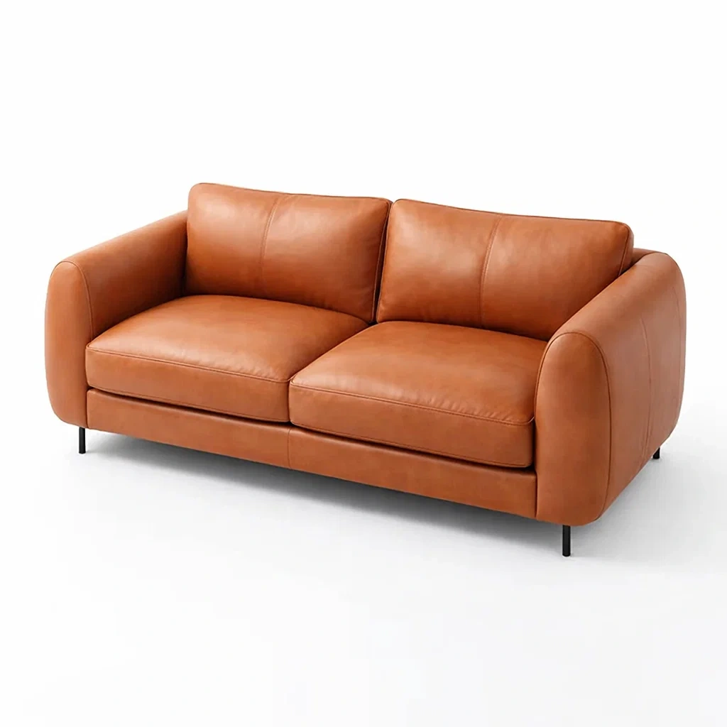 Canapé en cuir marron avec structure en bois et pieds métalliques