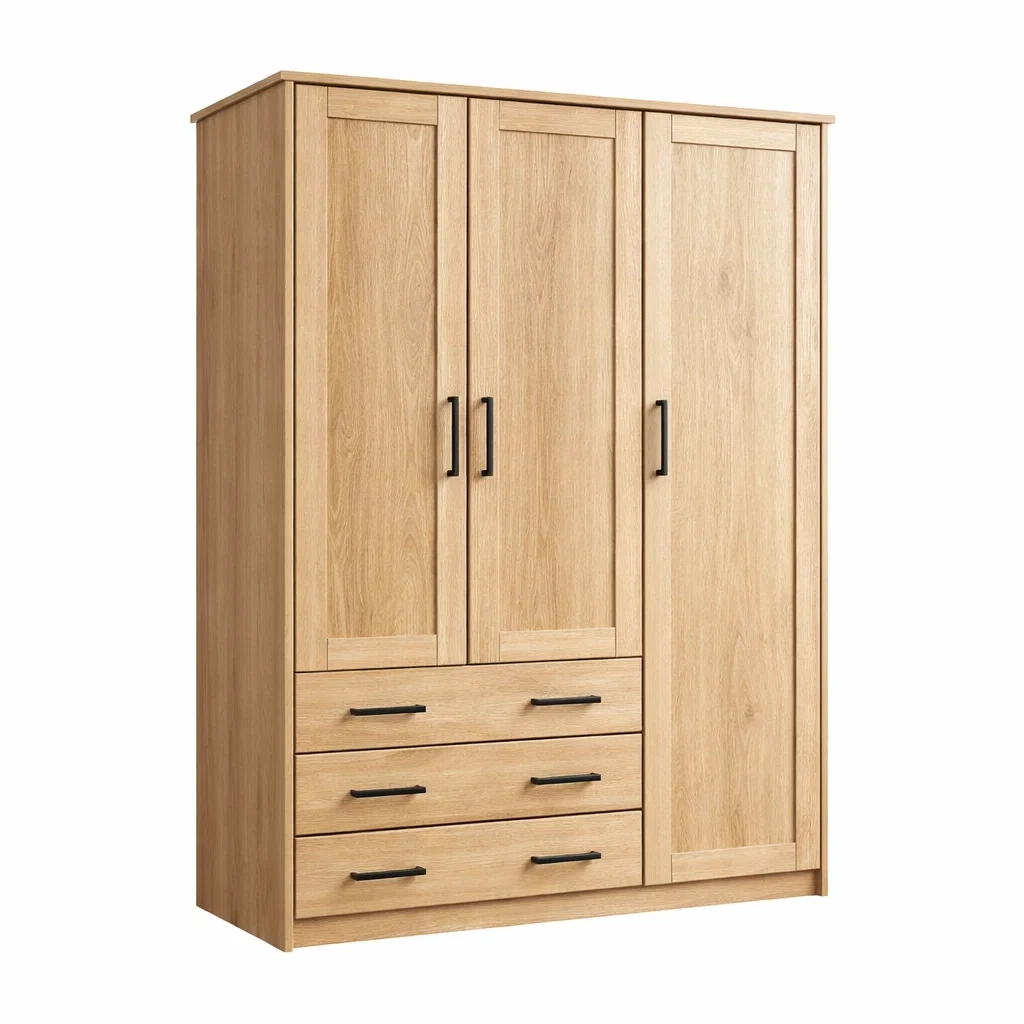 Structure : 3 portes, 3 tiroirs, penderie et étagères
