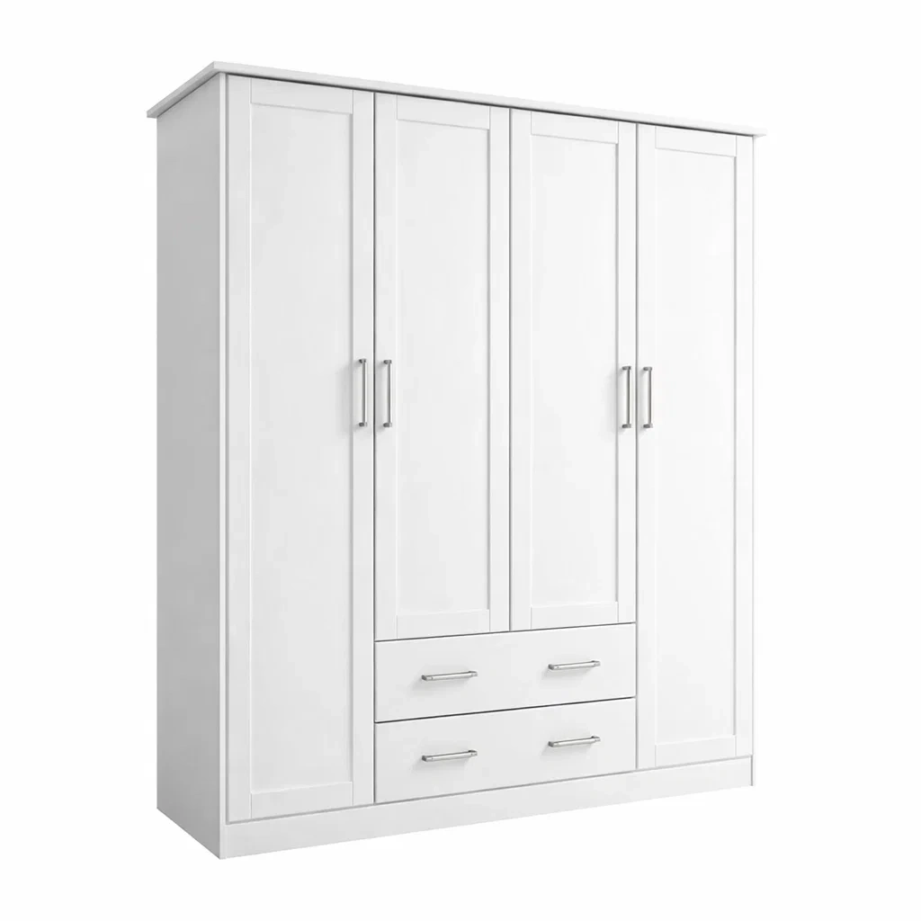 Cette armoire est fabriquée en panneaux de particules avec une finition mélaminée. Elle possède quatre portes avec des poignées métalliques pour une ouverture facile, et deux tiroirs spacieux pour un rangement supplémentaire. Les dimensions de l'armoire sont de 180 cm x 60 cm x 200 cm et son poids est de 95 kg. Les fixations sont métalliques, garantissant une structure stable. Pour l'entretien, un simple chiffon humide suffit.