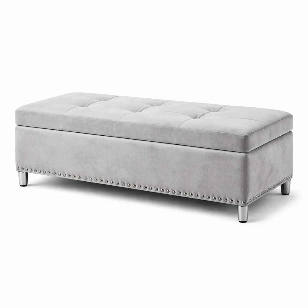 Le banc dispose d'un rangement sous le siège, orné de capitonnage et de clous décoratifs.