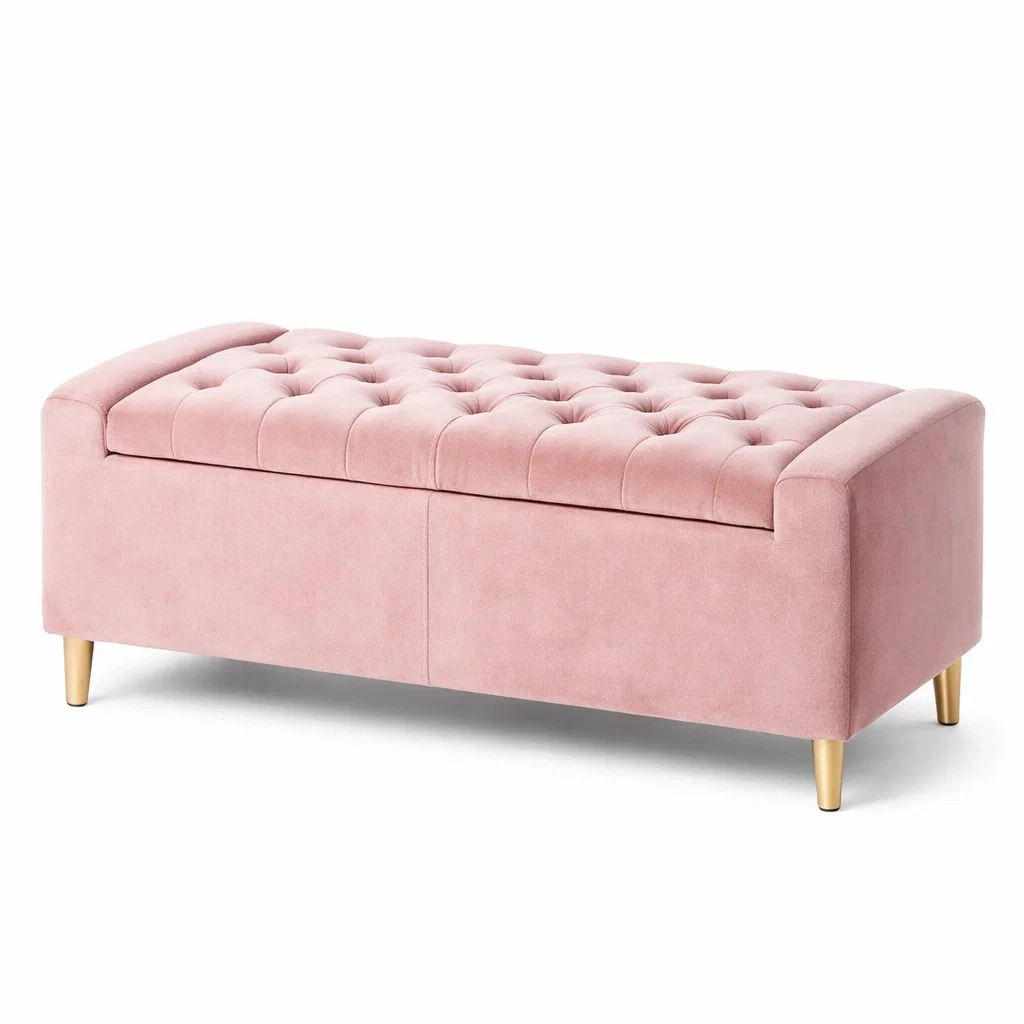 Ce banc est recouvert de velours avec des pieds métalliques dorés. La structure est en bois et le couvercle rembourré présente un capitonnage à boutons. Les dimensions sont de 120 cm de longueur, 45 cm de largeur et 45 cm de hauteur. Usage intérieur uniquement.