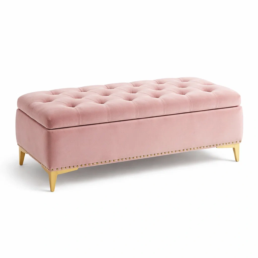 Ce banc de rangement est recouvert de velours rose doux et repose sur des pieds en bois pour une stabilité accrue. Les dimensions sont de 140 cm de longueur, 50 cm de profondeur et 45 cm de hauteur. Le banc offre un espace de rangement intérieur pratique. Son poids est de 12.5 kg et il peut supporter jusqu'à 120 kg.
