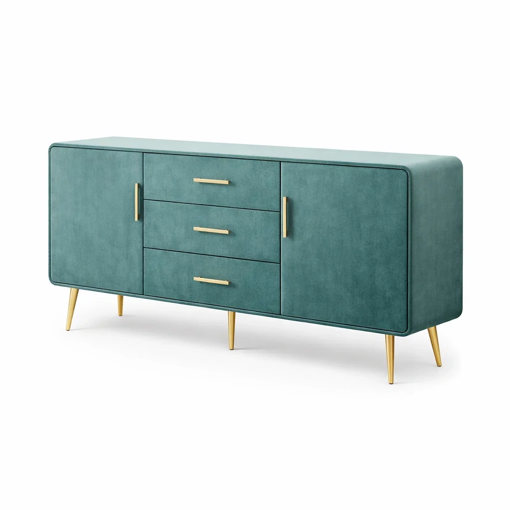 Ce buffet est fabriqué en panneau de fibres de bois avec un placage en polyuréthane (PU). Il comprend trois tiroirs et deux portes, offrant un espace de rangement pratique. Les poignées et les pieds sont en métal. Dimensions : longueur 150 cm, largeur 40 cm, hauteur 80 cm.