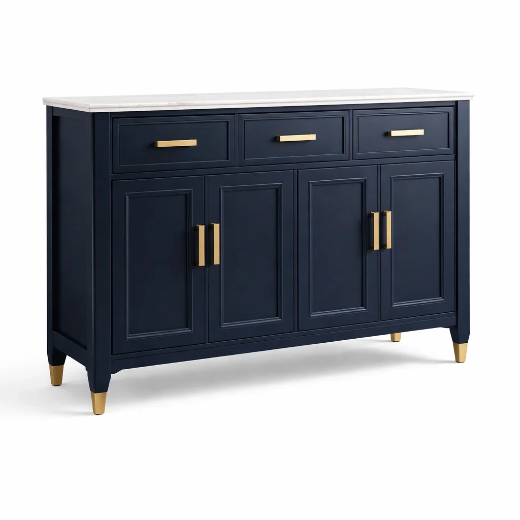 Buffet en Bois Bleu avec Plateau en Marbre Blanc et Poignées Dorées