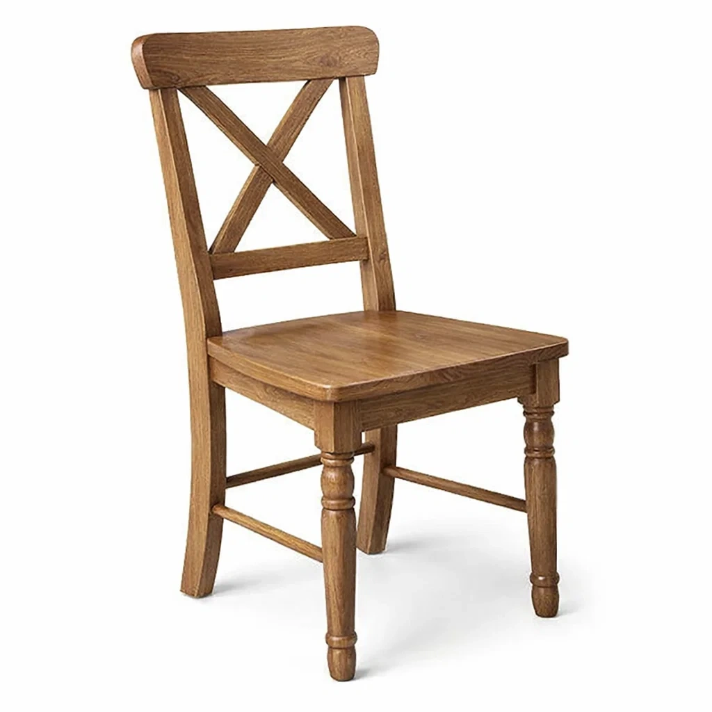 Cette chaise est fabriquée en chêne massif avec une finition en vernis naturel.