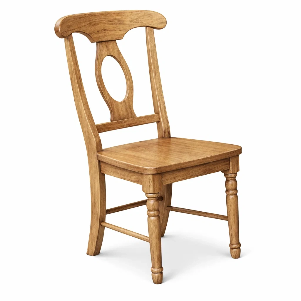 La chaise est fabriquée en chêne massif avec un dossier ajouré. Elle est équipée d'une finition en vernis translucide. Sa dimension est de 45 cm de largeur, 50 cm de profondeur, et 90 cm de hauteur. Elle pèse 6.50 kg. La capacité de charge est de 120 kg.
