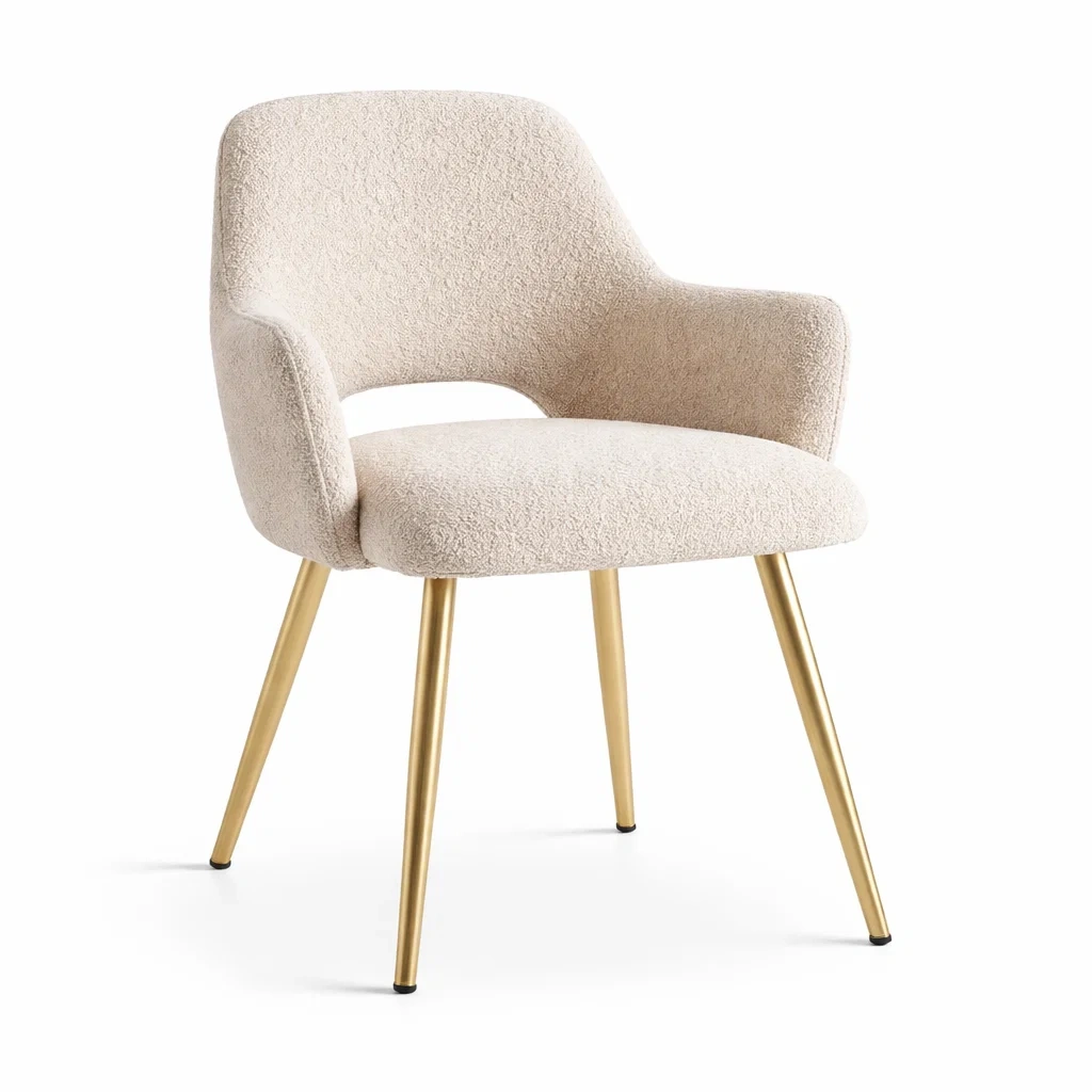 Cette chaise est recouverte de tissu bouclé beige, offrant une texture agréable. La structure et les pieds sont en acier doré. Dimensions : hauteur 80 cm, largeur 55 cm, profondeur 55 cm, hauteur de l'assise 45 cm. Poids du produit : 6 kg. Capacité de charge : 120 kg.
