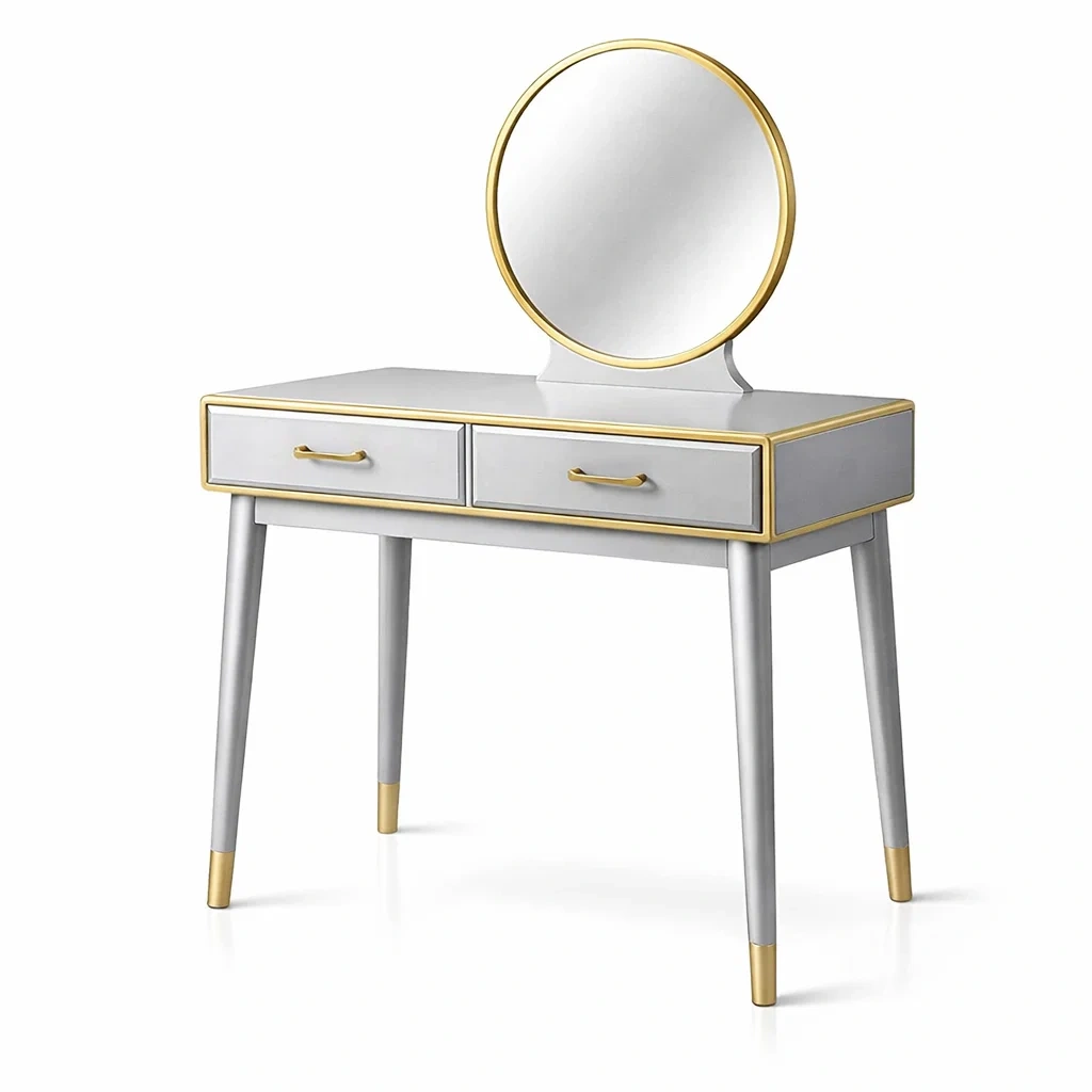 Cette coiffeuse est en bois avec des détails en métal et un miroir en verre trempé de 4 mm. La couleur est blanche avec des accents dorés.