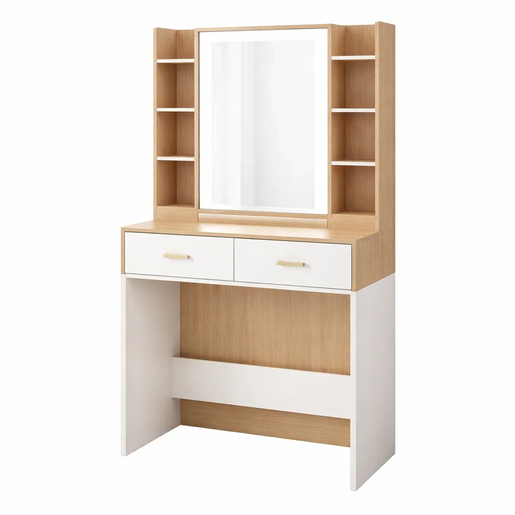 Cette coiffeuse est fabriquée en MDF avec un placage chêne et mélamine blanche. Elle comprend un miroir, deux tiroirs et plusieurs étagères fournissant un espace de rangement pratique. Dimensions : 80 cm x 140 cm x 40 cm. Poids total : 30 kg.